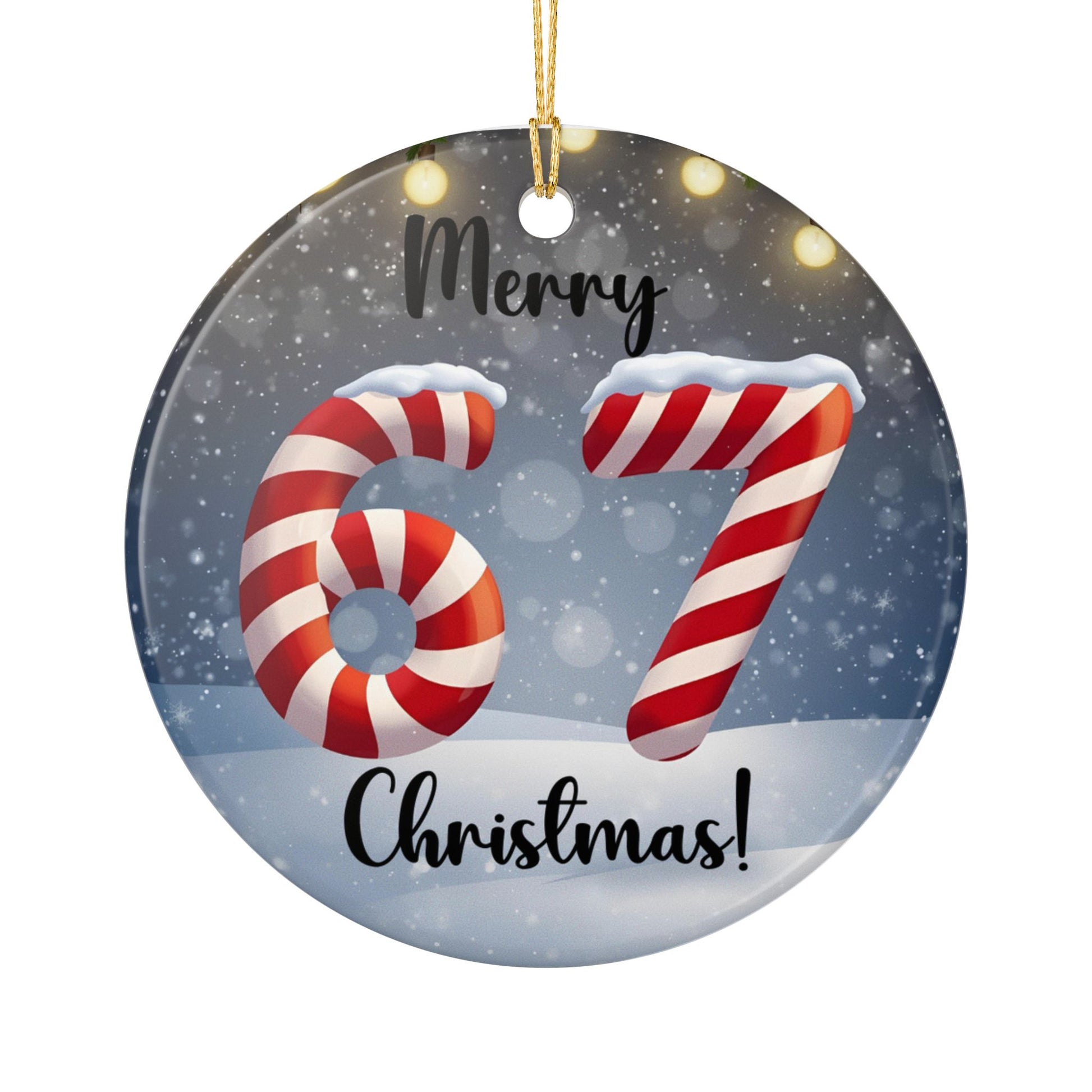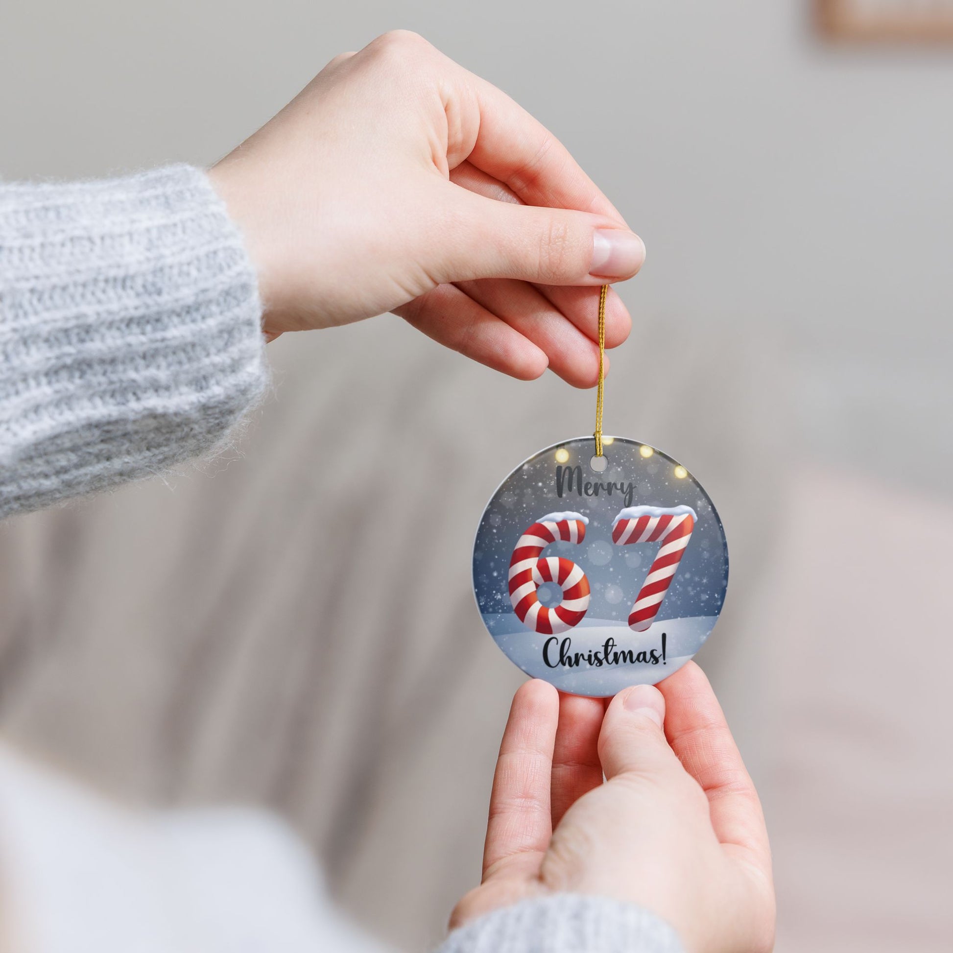 Ceramic Ornament — "Merry 67 Christmas!" Candy Cane Number Holiday Decoration