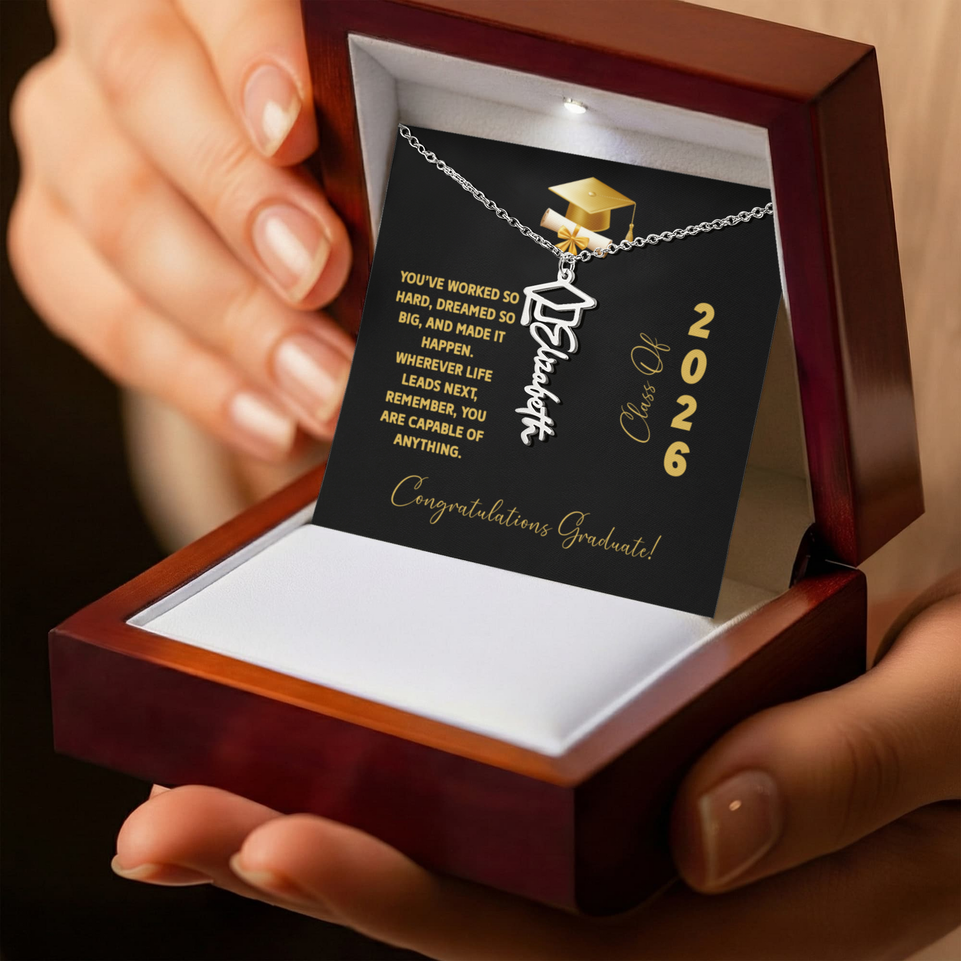 Thoughtfully personalized with the name or word of your choice, this necklace makes an unforgettable graduation gift for high school, college, or beyond. Whether worn on the big day or cherished for years to come, it’s a beautiful reminder of how far they’ve come—and how bright their future is.