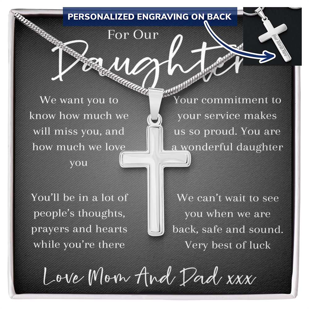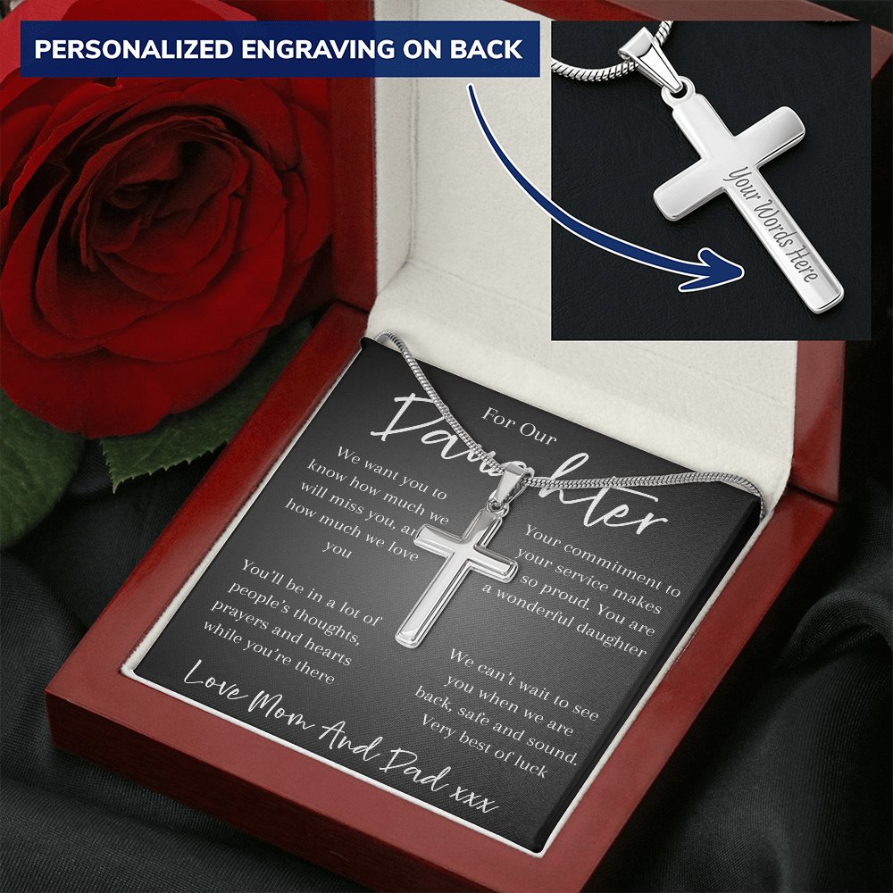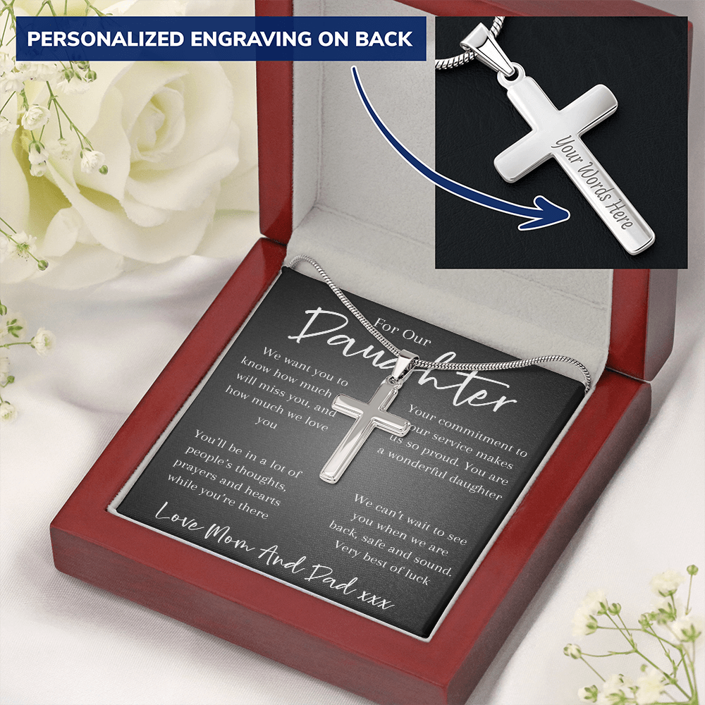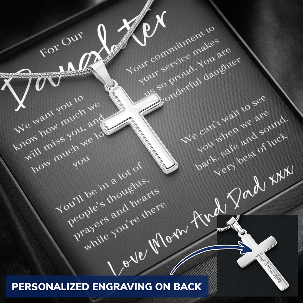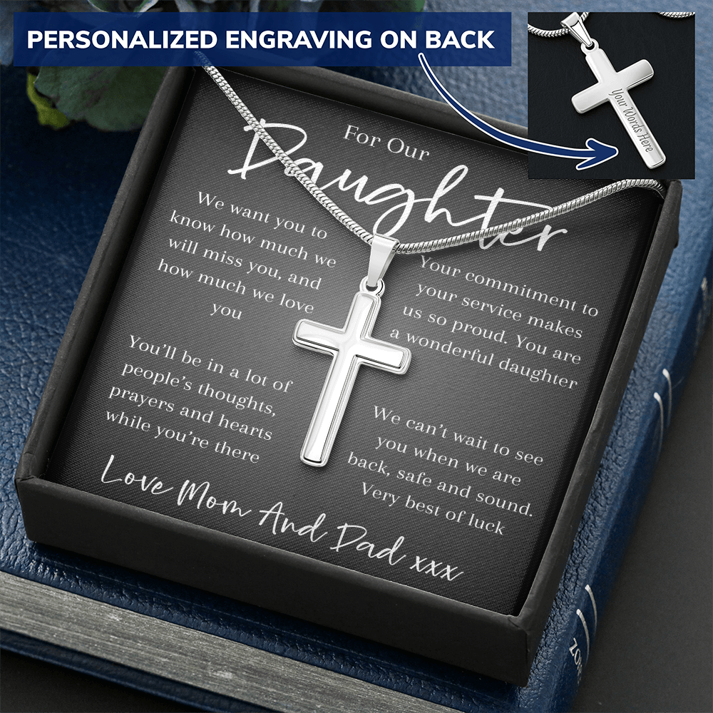 A heartfelt gift for a daughter facing deployment — this cross pendant chain is a symbol of faith, courage, and a parent’s enduring love. A reminder that wherever she goes, she’s never alone and always held close in heart and prayer.