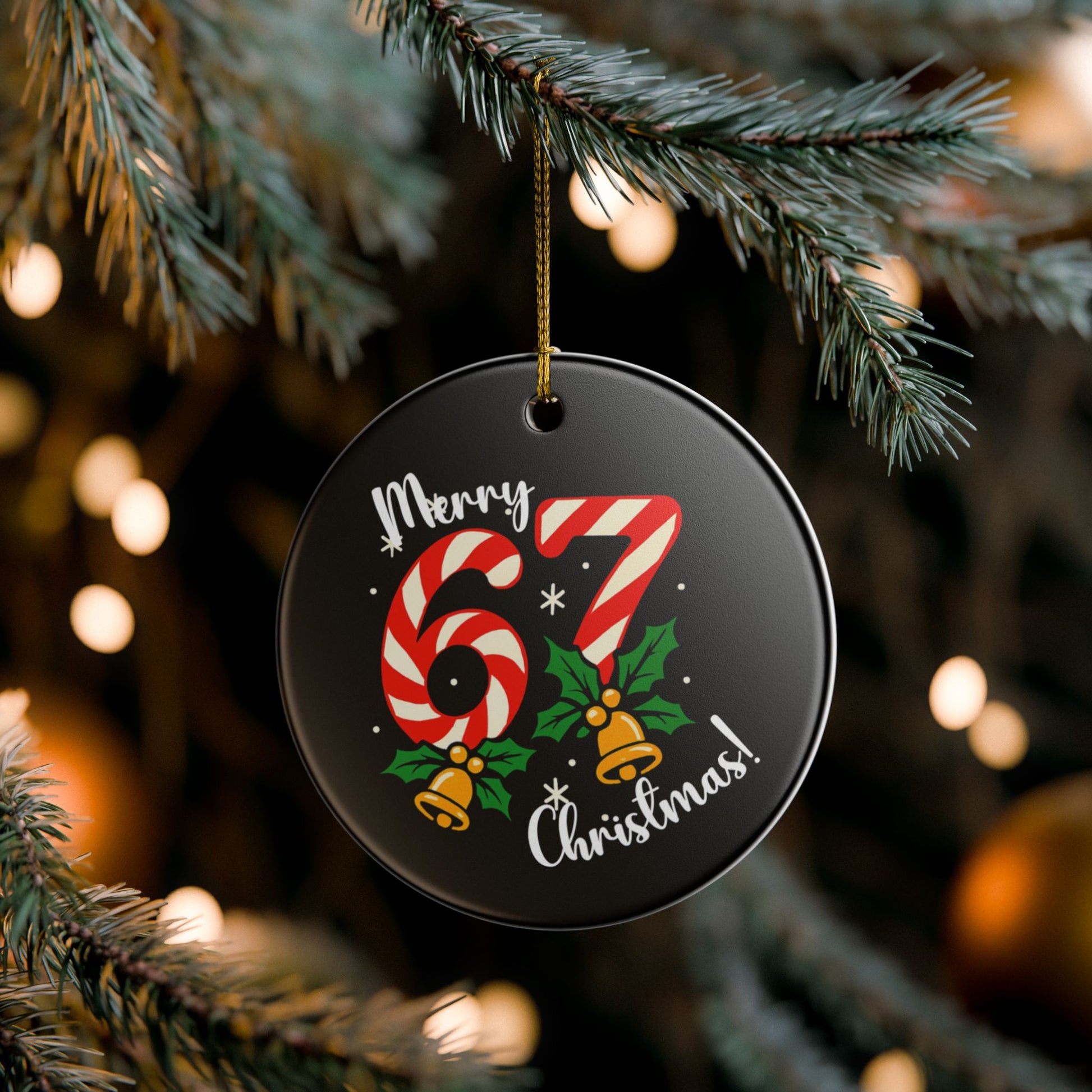 A glossy ceramic ornament that brings playful holiday cheer to your tree and will make any child smile - especially those that have driven you mad with the six seven craze!. The front features bold candy-cane striped numbers “67” framed by holly and golden bells, with a handwritten “Merry Christmas!” script that pops against the deep black background.
