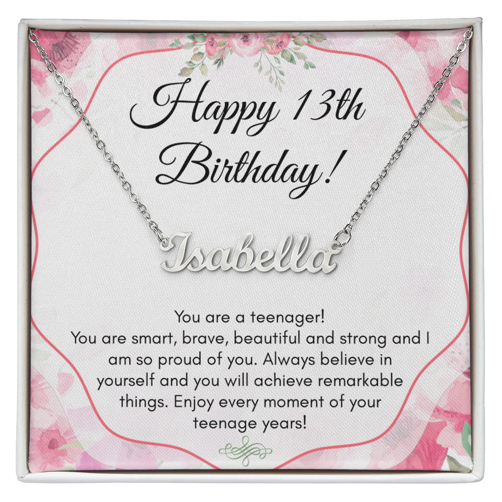 "Celebrate her 13th birthday with a custom name necklace made just for her. Thoughtfully personalized to reflect her unique identity, this elegant piece is a meaningful keepsake to mark the start of her teenage years — a gift she'll wear with pride and treasure for years to come.