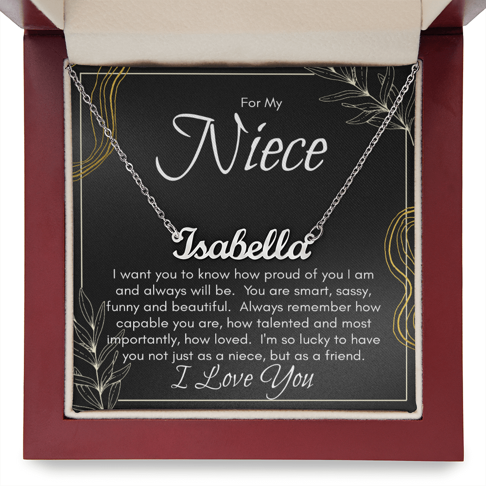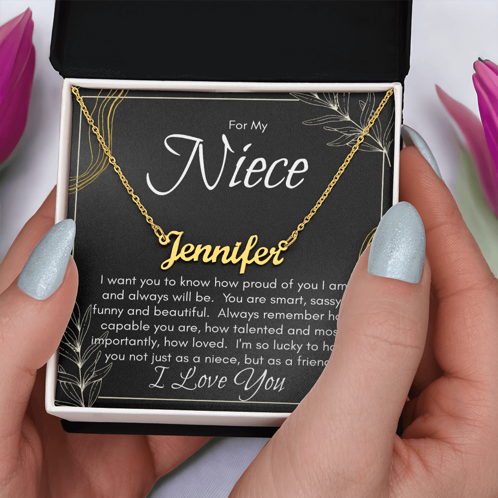A personalized name necklace for a beloved niece — a meaningful and stylish piece that celebrates her unique identity and the special bond you share. Whether it’s for her birthday, graduation, a holiday, or just because, this custom gift is a lasting reminder that she is deeply loved and truly one of a kind. Thoughtfully made just for her, it’s a keepsake she’ll treasure for years to come.
